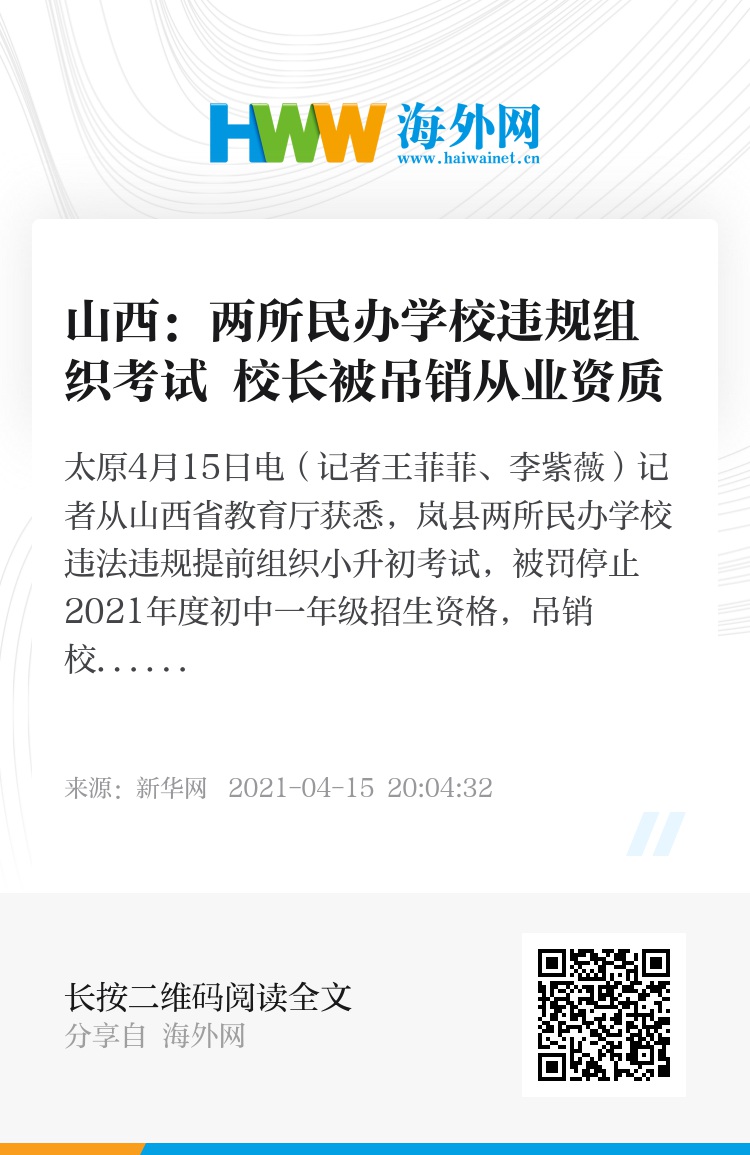 新华社太原4月15日电(记者王菲菲、李紫薇)记者从山西省教育厅获悉,岚县两所民办学校违法违规提前组织小升初考试,被罚停止2021年度初中一年级招生资格,吊销校长从业资质。