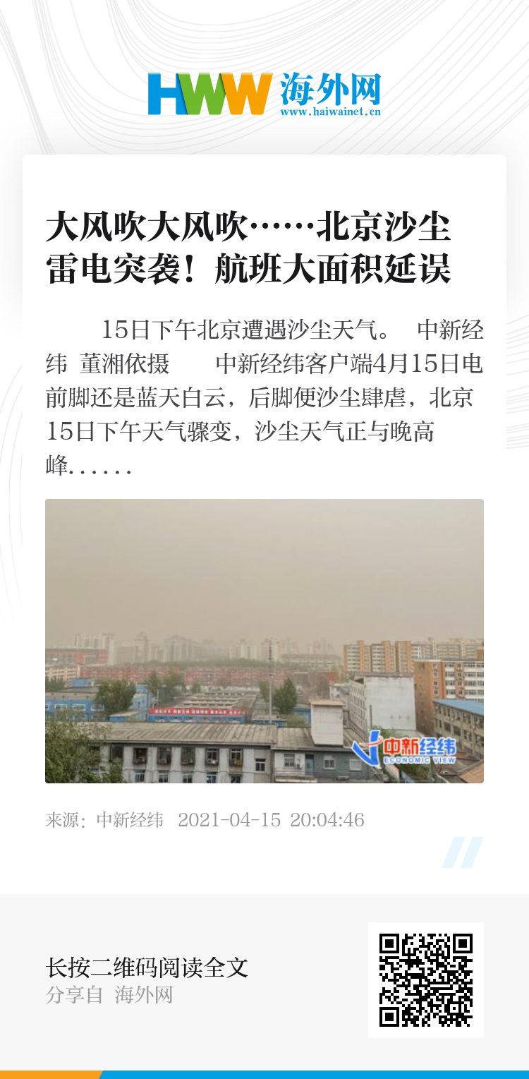 中新经纬客户端4月15日电 前脚还是蓝天白云,后脚便沙尘肆虐,北京15日下午天气骤变,沙尘天气正与晚高峰时间叠加。上班族要及时留意天气变化和航班动态。