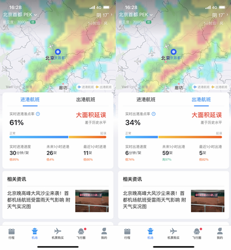 中新经纬客户端查询飞常准APP了解到,受雷雨天气影响,截至16:30,当前北京首都机场部分航班延误,正在延误进出港航班48架次,已取消进出港航班30 架次,已进港备降航班5架次,正在备降航班6架次,正在返航航班1架次。
