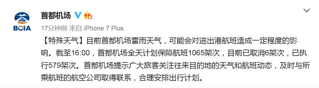 据首都机场官方微博消息,目前首都机场雷雨天气,可能会对进出港航班造成一定程度的影响。截至16:00,首都机场全天计划保障航班1065架次,目前已取消6架次,已执行579架次。首都机场提示广大旅客关注往来目的地的天气和航班动态,及时与所乘航班的航空公司取得联系,合理安排出行计划。