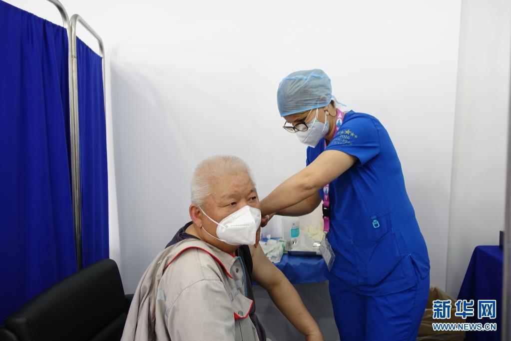 4月14日,在突尼斯首都突尼斯市,医务人员为一名中国公民接种新冠疫苗。新华社发