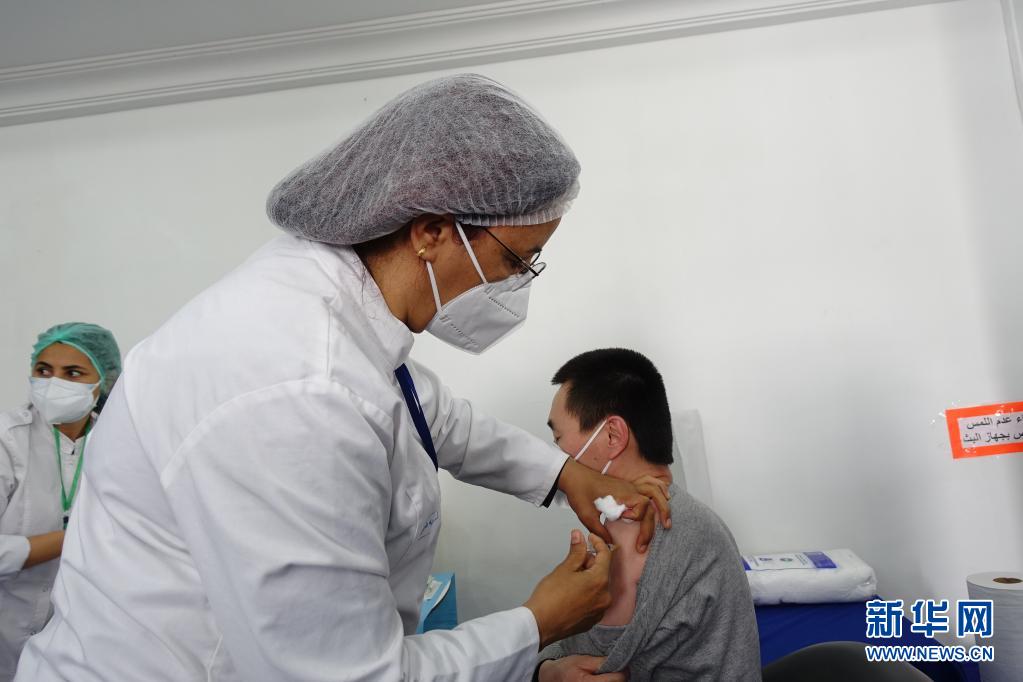 4月14日,在突尼斯首都突尼斯市,医务人员为一名中国公民接种新冠疫苗。新华社发