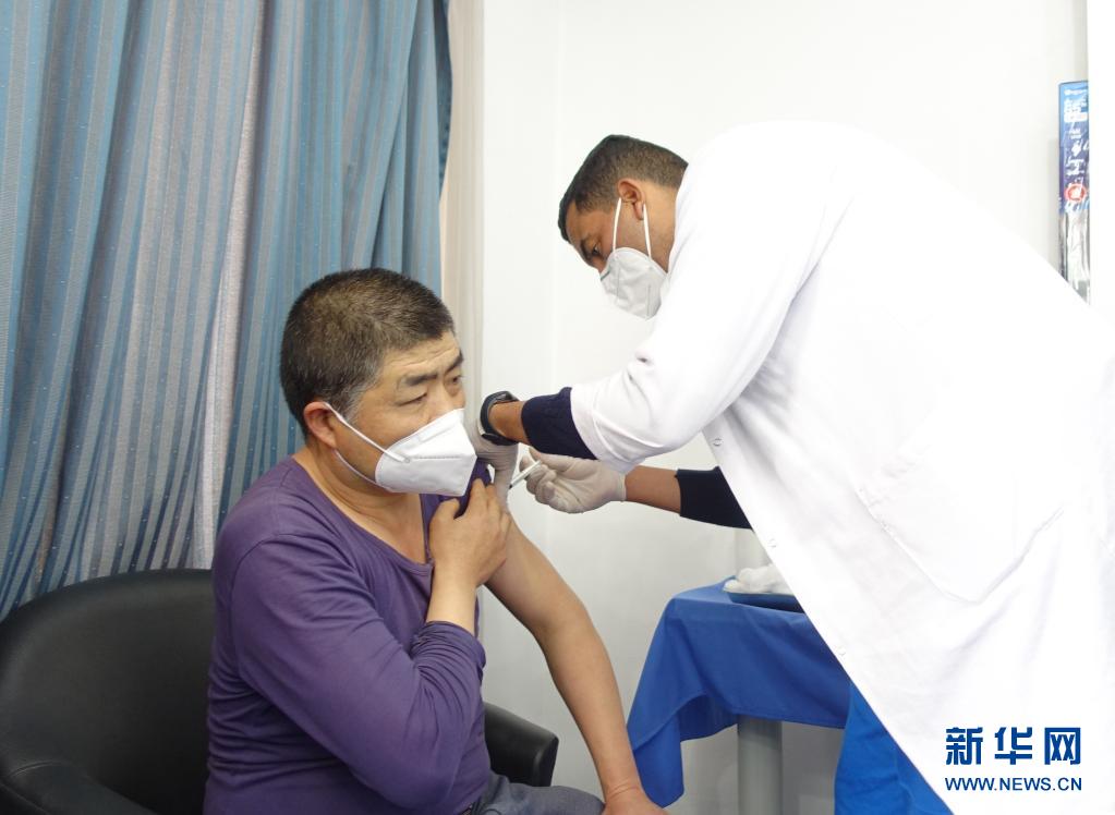 4月14日,在突尼斯首都突尼斯市,医务人员为一名中国公民接种新冠疫苗。新华社发
