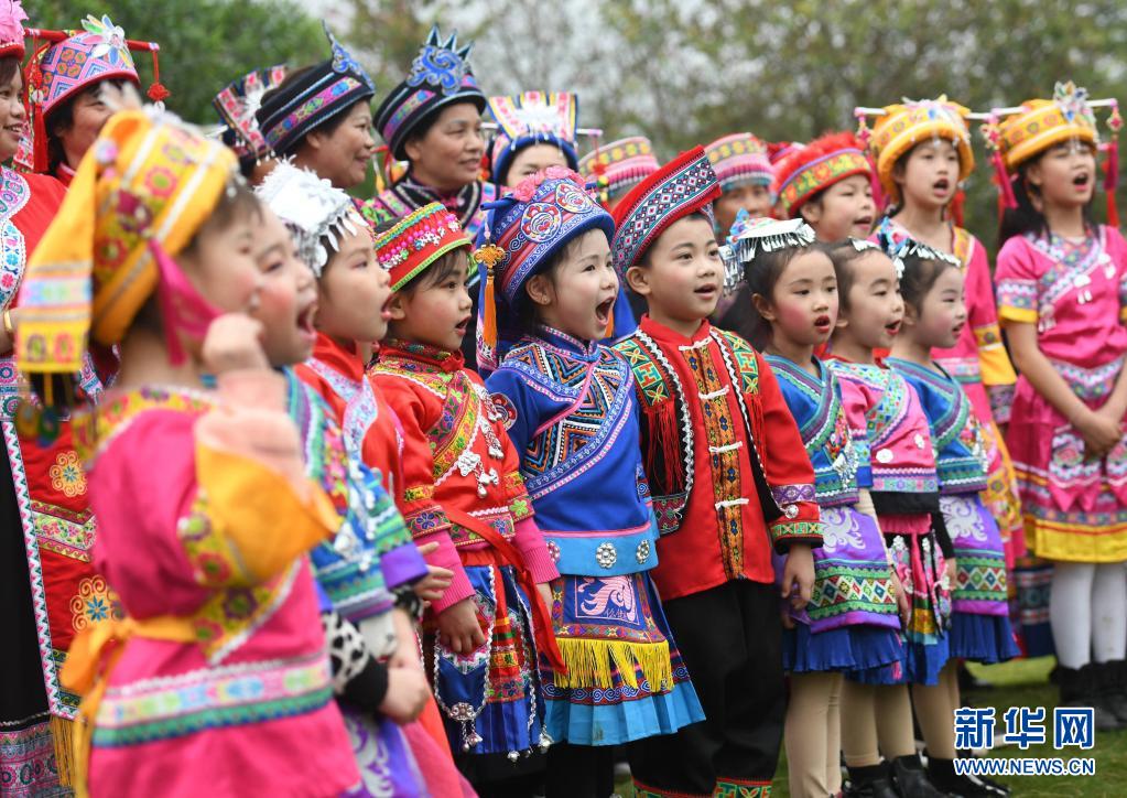 4月14日是农历三月初三,是我国部分地区少数民族的传统节日,少数民族同胞载歌载舞欢庆“三月三”。在广西河池市罗城仫佬族自治县成龙湖广场,小朋友唱山歌欢庆“三月三”。新华社发(蒙增师 摄) ​