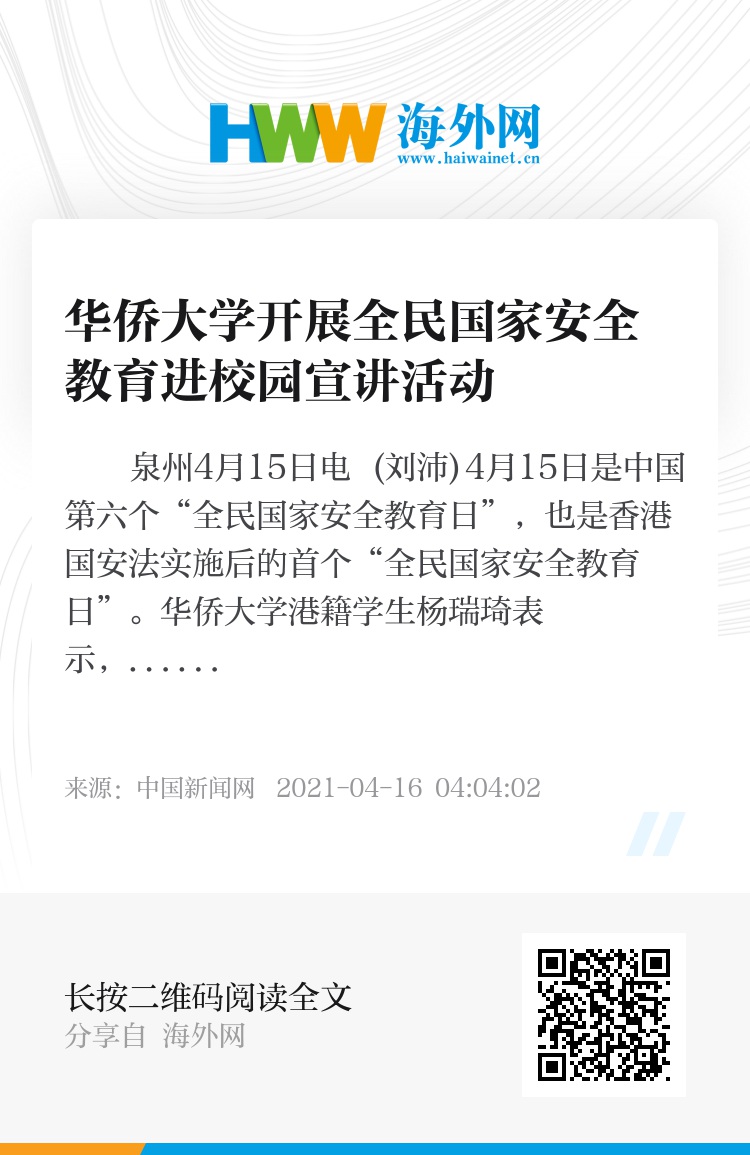 中新网泉州4月15日电 (刘沛)4月15日是中国第六个“全民国家安全教育日”,也是香港国安法实施后的首个“全民国家安全教育日”。华侨大学港籍学生杨瑞琦表示,“维护国家安全对社会或个人的发展都十分重要,更是我们每个人应尽的责任和义务。”