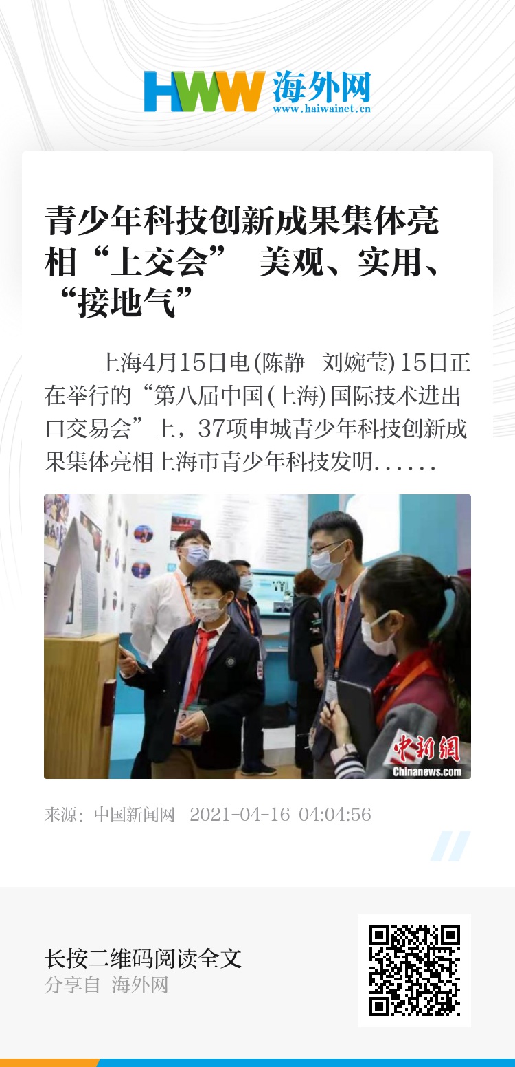 中新网上海4月15日电(陈静 刘婉莹)15日正在举行的“第八届中国(上海)国际技术进出口交易会”上,37项申城青少年科技创新成果集体亮相上海市青少年科技发明成果展。
