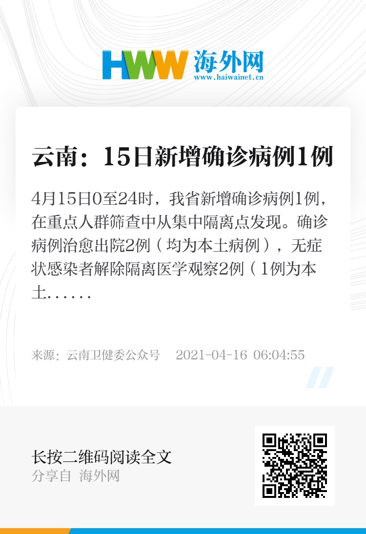 32059090,.云南:15日新增确诊病例1例,.2021-04-16 06:33:55,.204517,.安再尔江•艾合买提