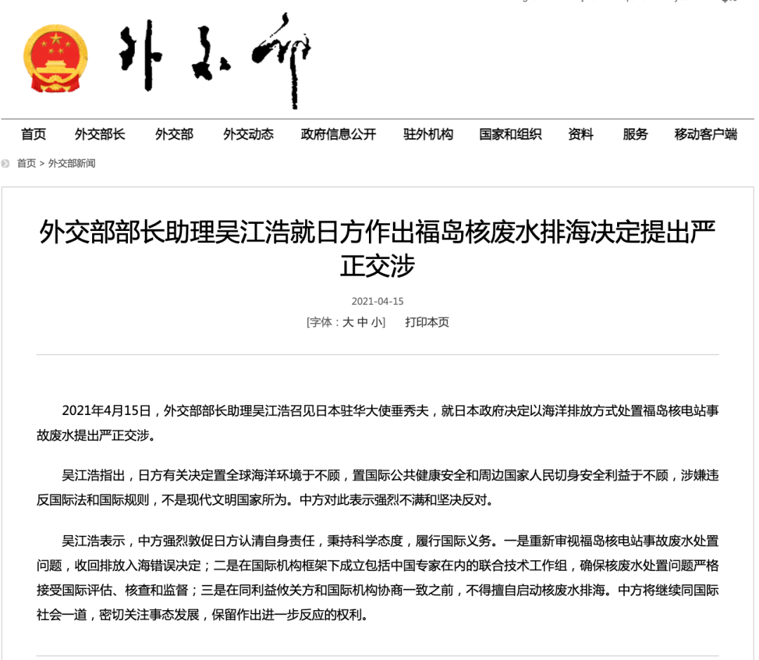 2021年4月15日,外交部部长助理吴江浩召见日本驻华大使垂秀夫,就日本政府决定以海洋排放方式处置福岛核电站事故废水提出严正交涉。
