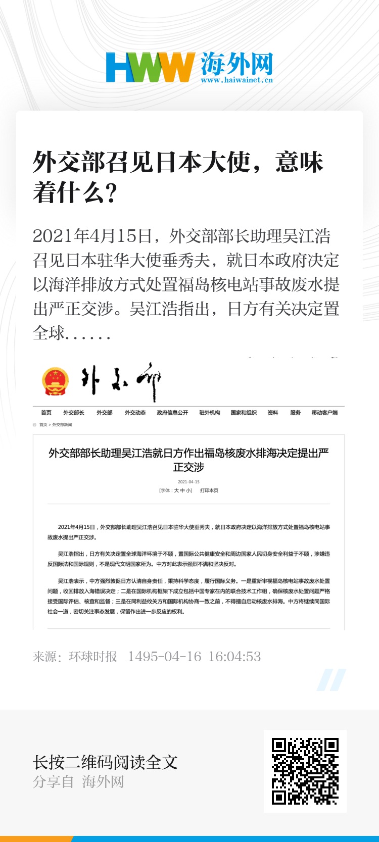 2021年4月15日,外交部部长助理吴江浩召见日本驻华大使垂秀夫,就日本政府决定以海洋排放方式处置福岛核电站事故废水提出严正交涉。
