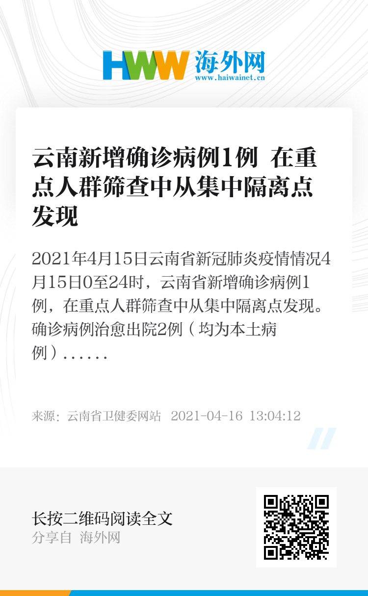 4月15日0至24时,云南省新增确诊病例1例,在重点人群筛查中从集中隔离点发现。确诊病例治愈出院2例(均为本土病例),无症状感染者解除隔离医学观察2例(1例为本土,1例为境外输入)。