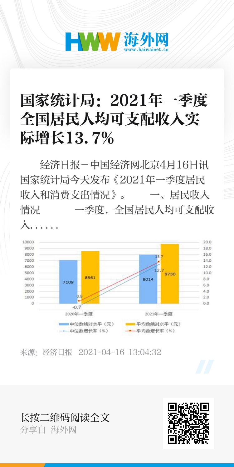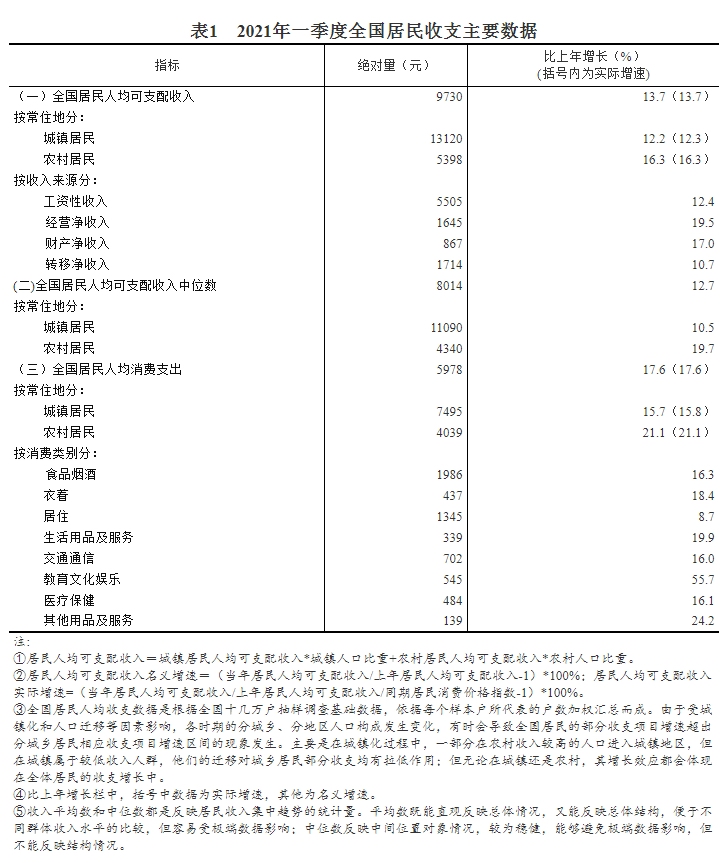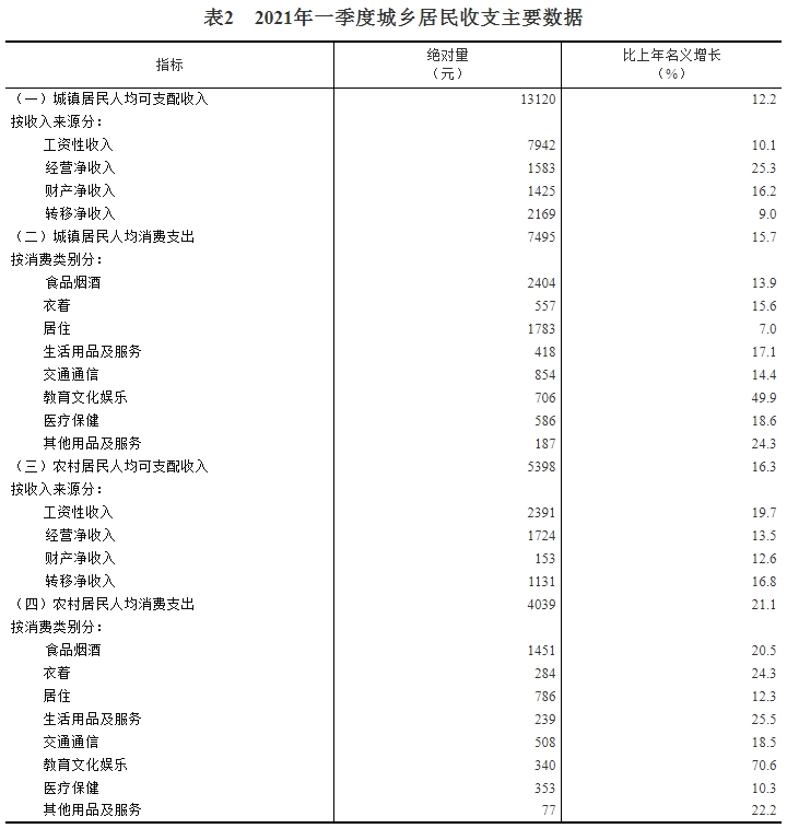 经济日报-中国经济网北京4月16日讯 国家统计局今天发布《2021年一季度居民收入和消费支出情况》。
