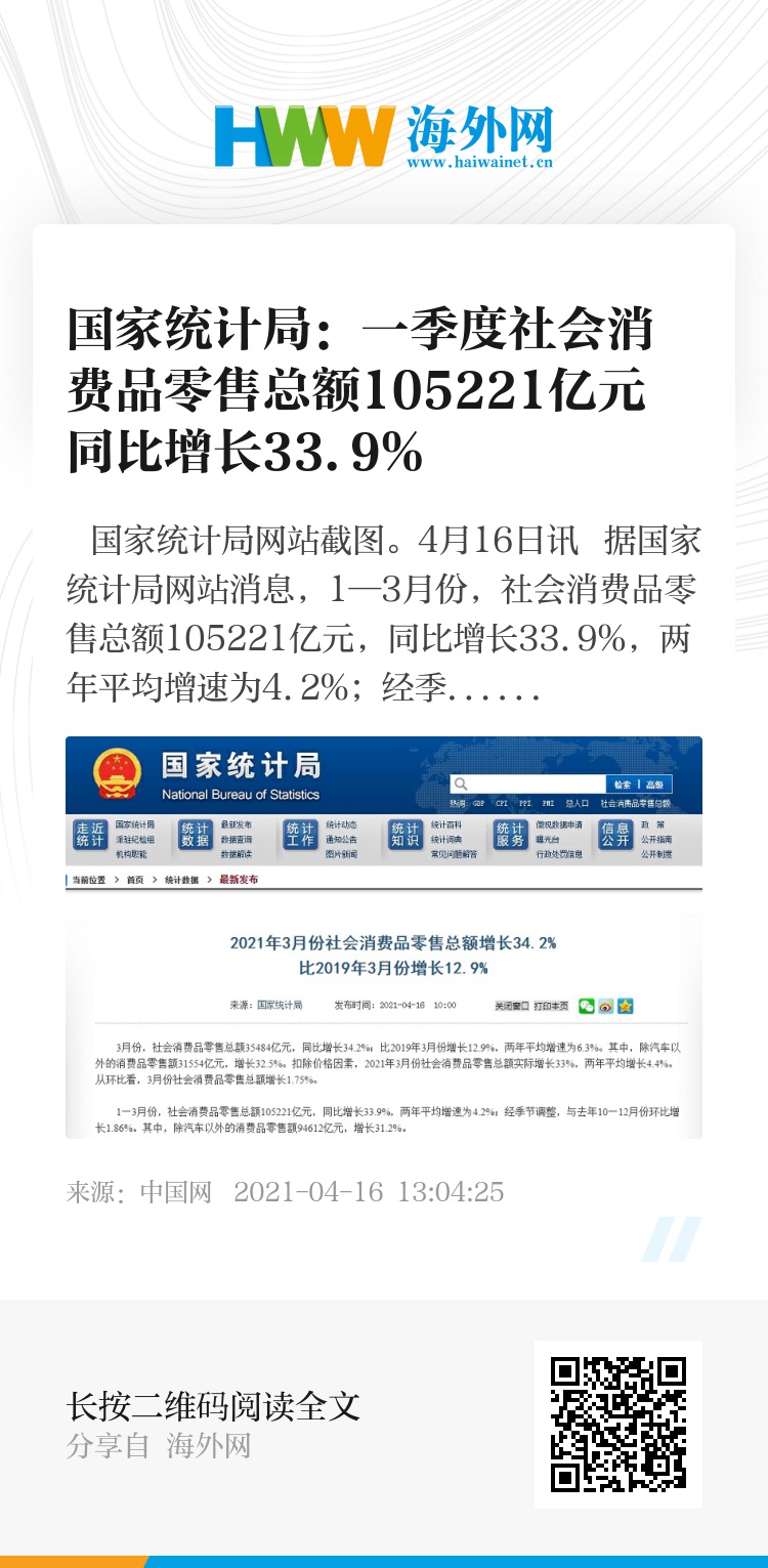 中国网4月16日讯 据国家统计局网站消息,1—3月份,社会消费品零售总额105221亿元,同比增长33.9%,两年平均增速为4.2%;经季节调整,与去年10—12月份环比增长1.86%。其中,除汽车以外的消费品零售额94612亿元,增长31.2%。