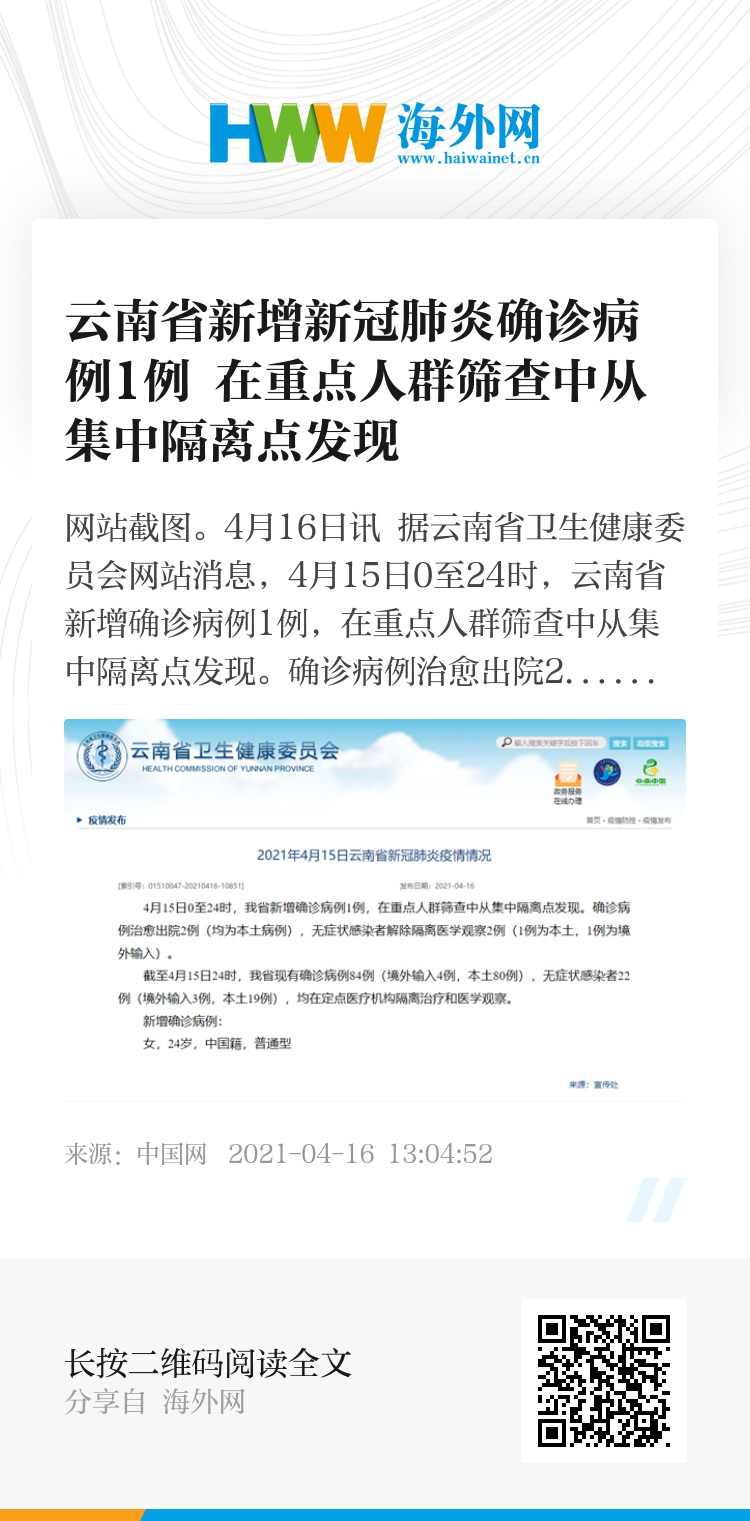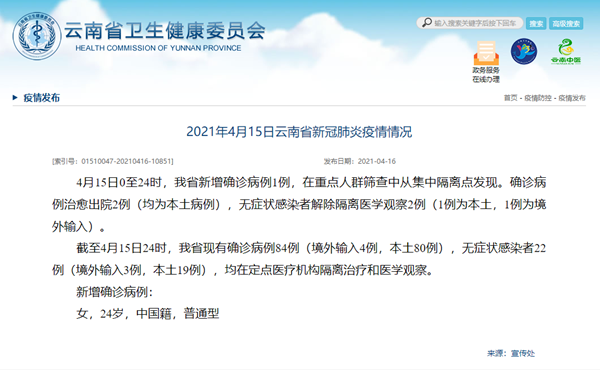 中国网4月16日讯 据云南省卫生健康委员会网站消息,4月15日0至24时,云南省新增确诊病例1例,在重点人群筛查中从集中隔离点发现。确诊病例治愈出院2例(均为本土病例),无症状感染者解除隔离医学观察2例(1例为本土,1例为境外输入)。