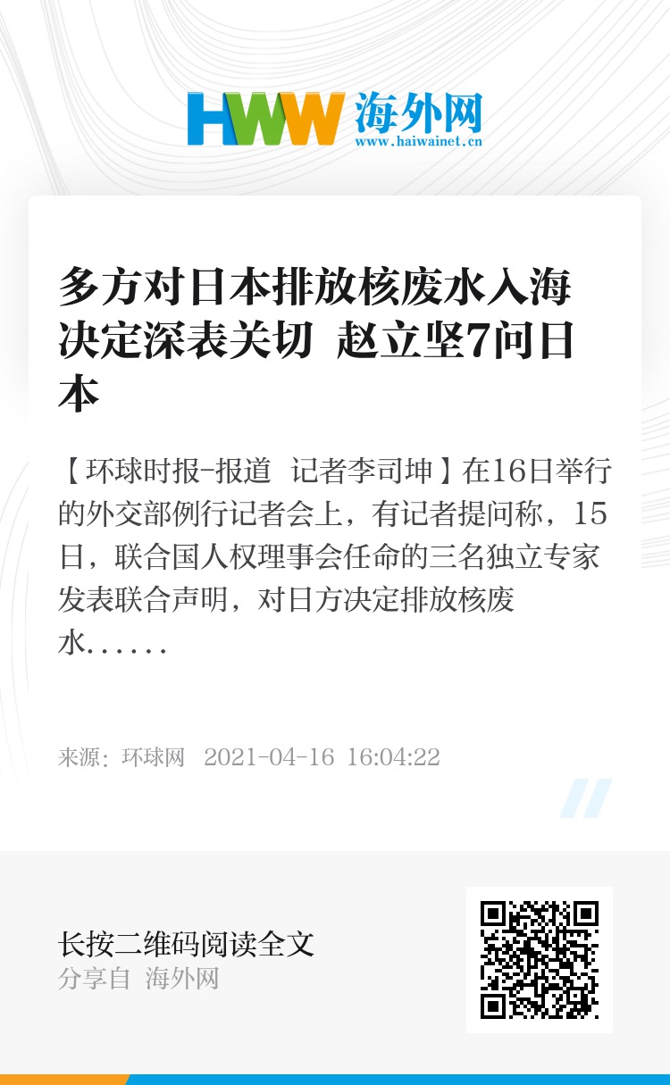 赵立坚指出,世界各国难以理解的是,日方在没有穷尽安全处置手段的情况下,为何执意选择损害全球海洋环境的危险方式?日方强调排放的是经处理的净化水,又何必建造储存罐严密封装?日方称,排放参照国际惯例和国际标准,但全世界还没有将核事故产生的污染水排海的先例,哪来的惯例呢?日方单方面得出的标准得到哪个第三方机构客观独立的验证和认可了吗?日方摆出一副重视外界关切的姿态,有没有和周边国家及国际环保组织充分协商呢?为什么迟迟不愿在国际机构框架下成立包括中国专家在内的技术联合工作组,接受国际评估核查和监督?“据路透社报道,4月12日,一名日本政府高官发邮件要求国际媒体不要使用受污染一词来形容核废水。如果确实没有污染,日方心虚什么?”