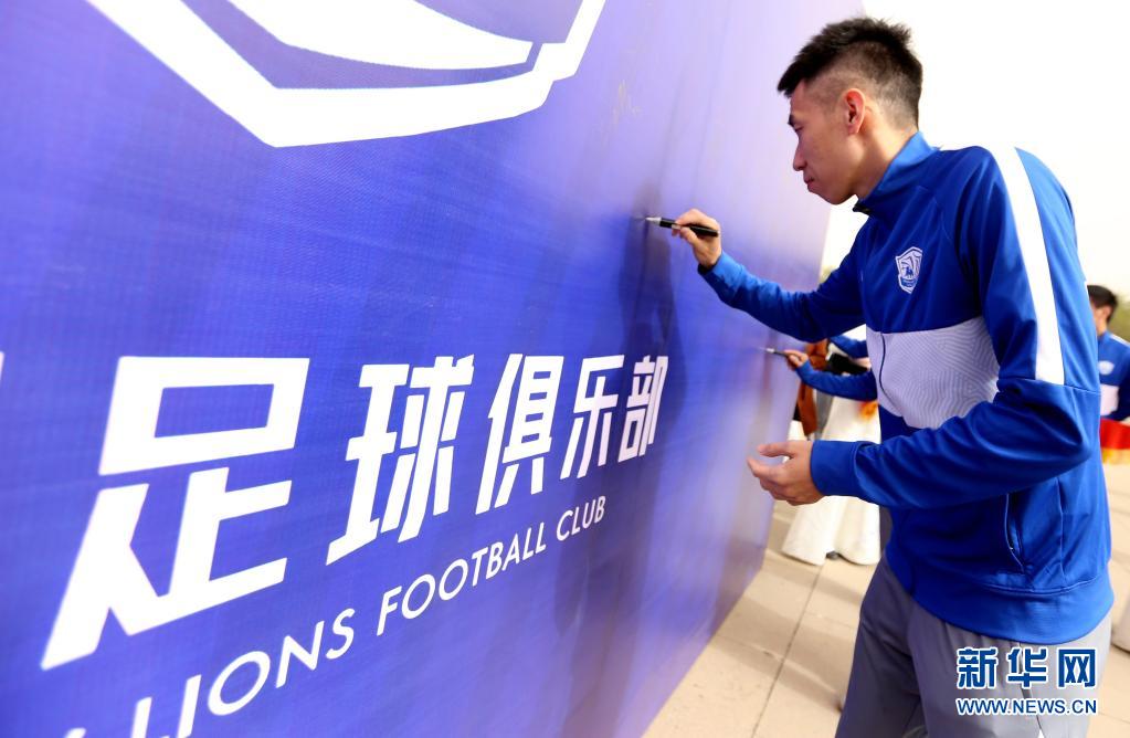 4月16日,沧州雄狮队球员刘鑫瑜在出征仪式上签名。