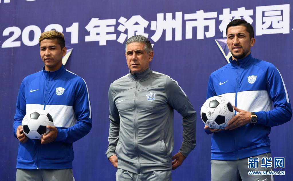 4月16日,沧州雄狮队球员阿布都海米提、主教练古特比、球员艾哈迈多夫(从左至右)参加出征仪式。