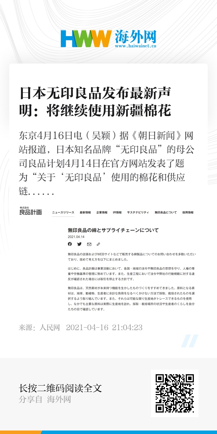 人民网东京4月16日电(吴颖)据《朝日新闻》网站报道,日本知名品牌“无印良品”的母公司良品计划4月14日在官方网站发表了题为“关于‘无印良品’使用的棉花和供应链”的声明。声明称,该公司曾委托第三方机构赴中国新疆地区检查,并未发现任何违反法律法规或该公司行为准则的情况。无印良品将继续使用新疆棉花。