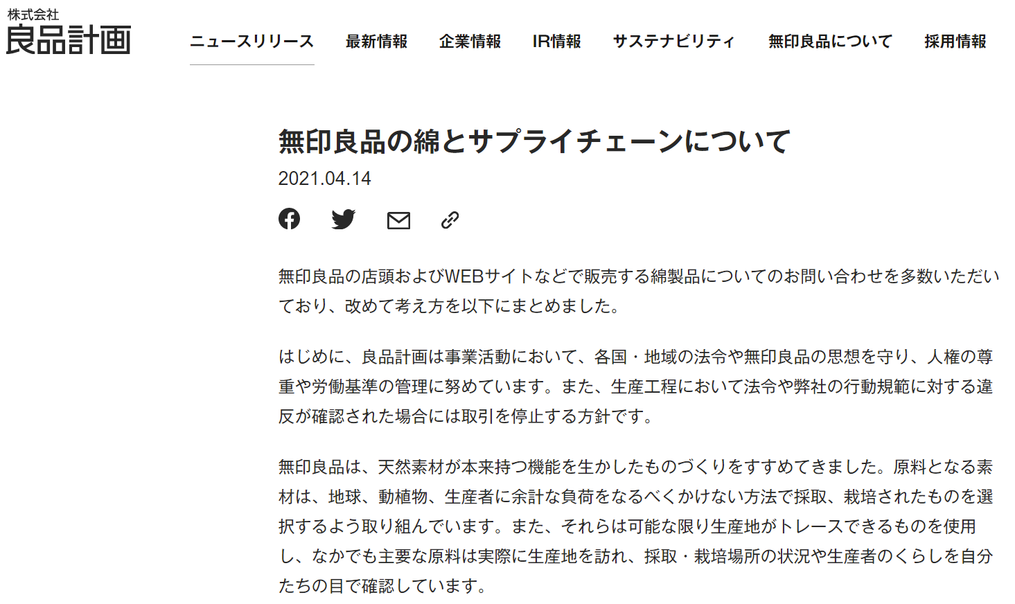 该声明表示,新疆产棉花占了中国棉花的8至9成。向无印良品供货的新疆棉花栽培农场约有5000公顷,该公司已派遣第三方机构针对棉田、工作人员信息及栽培日程等情况进行了调查,去年也进行了监督检查。在至今为止的调查中,未发现任何严重违反法令或该公司行为准则的情况。