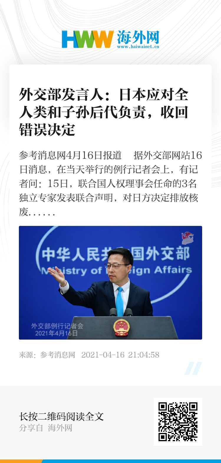 赵立坚指出,世界各国难以理解的是:日方在没有穷尽安全处置手段的情况下,为何执意选择损害全球海洋环境的危险方式?日方强调排放的是经处理的“净化水”,又何必建造储存罐严密封装?日方称排放参照国际惯例和国际标准,但全世界还没有将核事故产生的污染水排海的先例,哪来的惯例呢?日方单方面得出的“标准”得到哪个第三方机构客观独立的验证和认可了吗?日方摆出一副重视外界关切的姿态,有没有和周边国家及国际环保组织充分协商?为什么迟迟不愿在国际机构框架下成立包括中国专家在内的技术联合工作组,接受国际评估、核查和监督?据路透社报道,4月12日,一名日本政府高官发邮件要求国际媒体不要使用“受污染”一词来形容核废水。如果确实没有污染,那日方心虚什么?