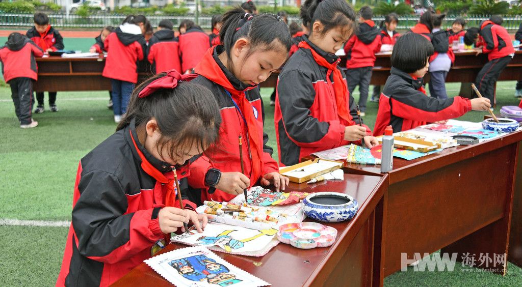 4月15日,浙江省台州市仙居县埠头镇中心小学在校运动场举行了“百年党史 手绘邮集”活动,100多位学生在老师指导下将党史故事、党史知识用国画、版画、儿童画等形式,手绘成一张张邮票,让学生在活动中领悟“知史爱党,知史爱国”。(供图:东方IC)