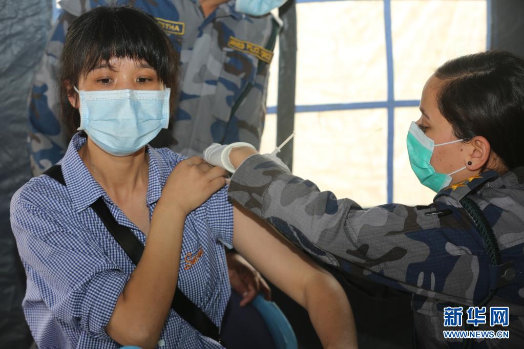 4月15日,一名女子在尼泊尔加德满都的尼武警医院接种中国产新冠疫苗。为海外中国公民接种新冠疫苗的“春苗行动”15日在位于尼泊尔首都加德满都的尼武警医院正式启动。新华社记者 周盛平 摄