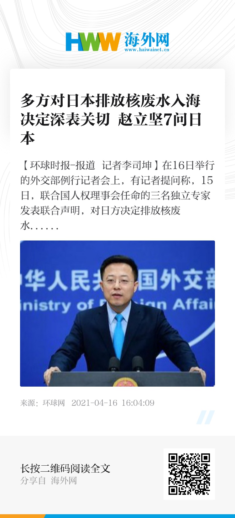 “我要强调的是,核废水排海不能成为第一选项,更不能成为唯一选项。日本应对全人类负责,对子孙后代负责,重视并重新审视、收回错误决定,日本应该诚恳面对各国的一致反对的声音,自觉接受包括中国在内的国际社会的实质参与和监督,让福岛核废水处置问题完全在阳光下运行。”赵立坚说道。