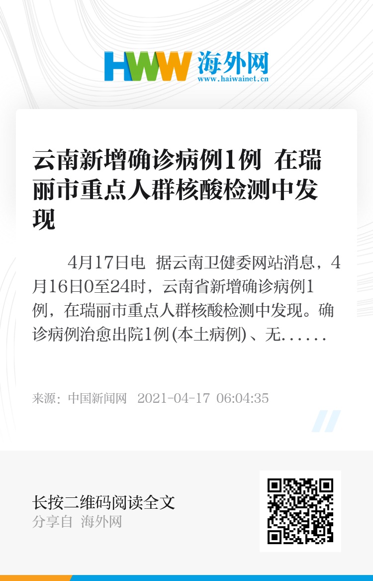 中新网4月17日电 据云南卫健委网站消息,4月16日0至24时,云南省新增确诊病例1例,在瑞丽市重点人群核酸检测中发现。确诊病例治愈出院1例(本土病例)、无症状感染者解除隔离医学观察2例(均为本土病例)。