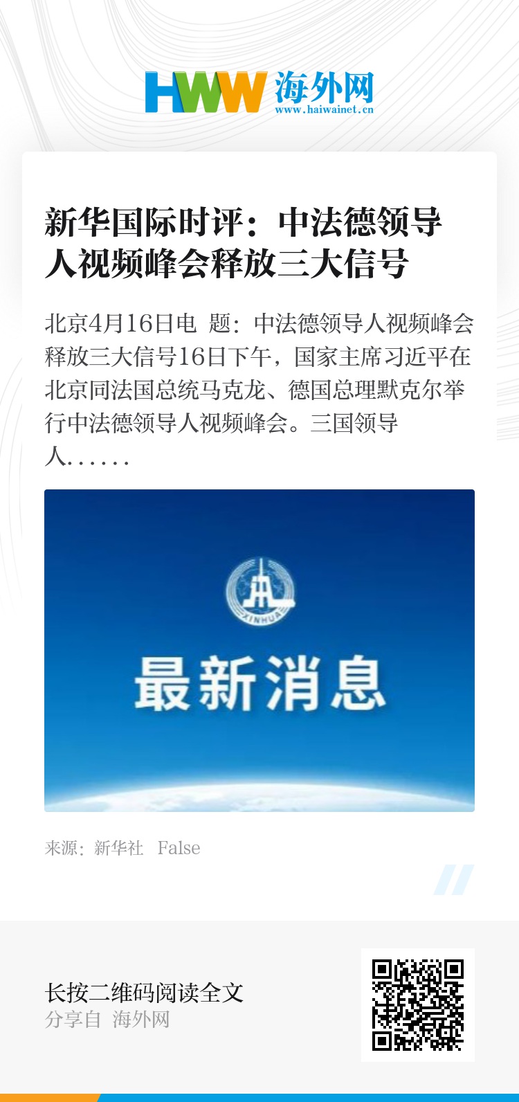 新华社北京4月16日电 题:中法德领导人视频峰会释放三大信号