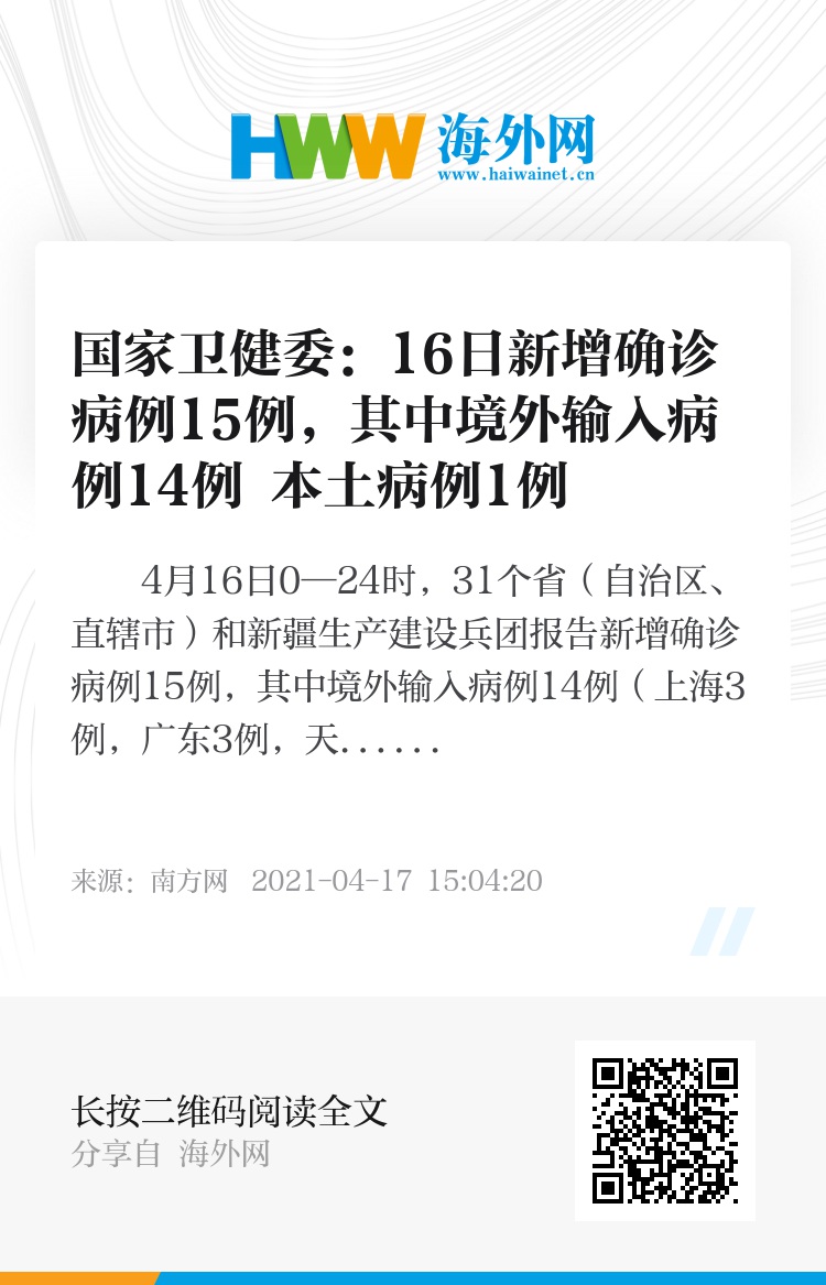 4月16日0—24时,31个省(自治区、直辖市)和新疆生产建设兵团报告新增确诊病例15例,其中境外输入病例14例(上海3例,广东3例,天津2例,四川2例,陕西2例,内蒙古1例,浙江1例),本土病例1例(在云南);无新增死亡病例;无新增疑似病例。