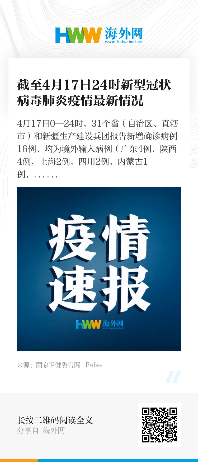 4月17日0—24时,31个省(自治区、直辖市)和新疆生产建设兵团报告新增确诊病例16例,均为境外输入病例(广东4例,陕西4例,上海2例,四川2例,内蒙古1例,福建1例,河南1例,云南1例);无新增死亡病例;新增疑似病例1例,为境外输入病例(在上海)。