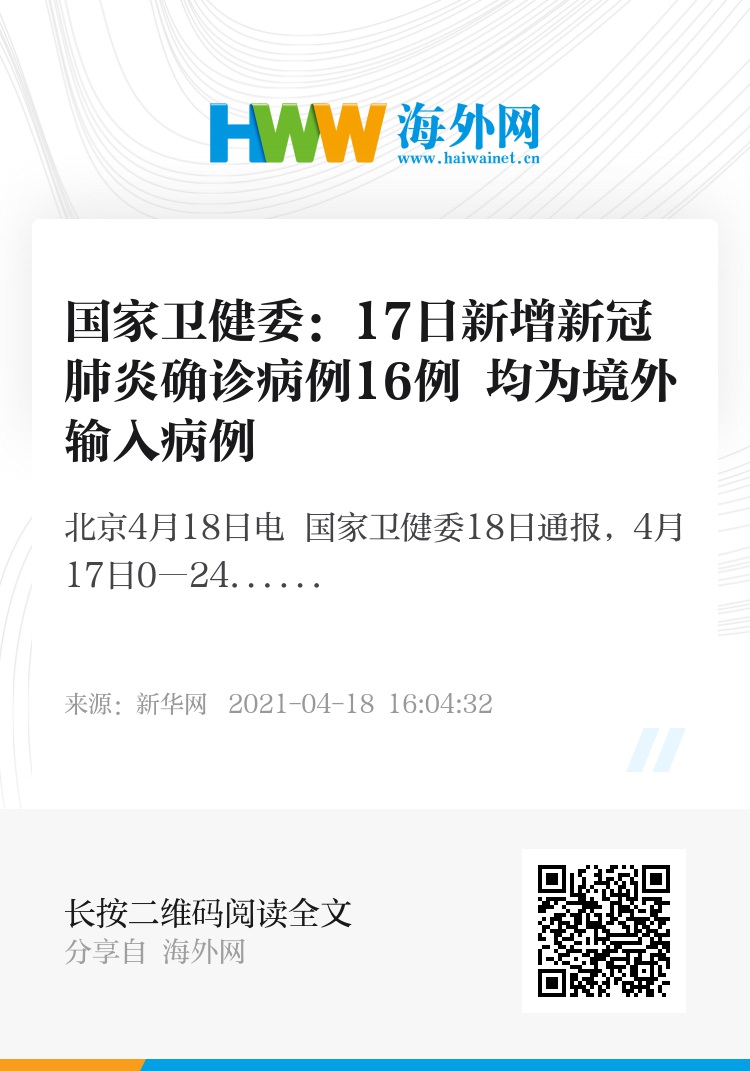 新华社北京4月18日电 国家卫健委18日通报,4月17日0―24时,31个省(自治区、直辖市)和新疆生产建设兵团报告新增确诊病例16例,均为境外输入病例(广东4例,陕西4例,上海2例,四川2例,内蒙古1例,福建1例,河南1例,云南1例);无新增死亡病例;新增疑似病例1例,为境外输入病例(在上海)。