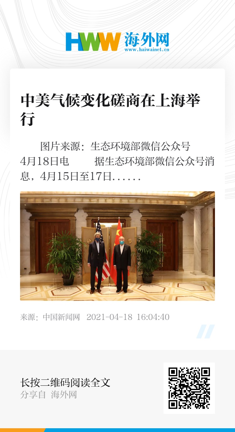 中新网4月18日电 据生态环境部微信公众号消息,4月15日至17日,中国气候变化事务特使解振华同美国总统气候问题特使克里在上海举行会谈。双方就合作应对气候变化、领导人气候峰会、联合国气候公约第二十六次缔约方大会等议题进行了坦诚、深入、建设性沟通交流,取得积极进展,达成应对气候危机联合声明,重启中美气候变化对话合作渠道。