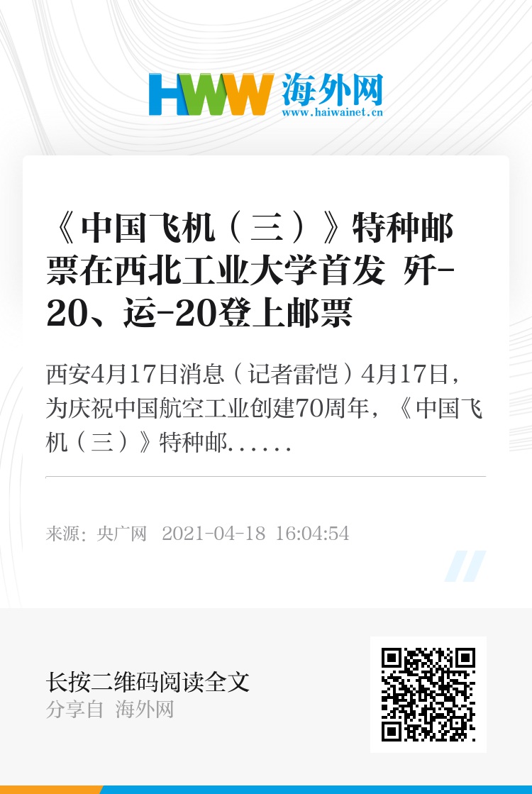 央广网西安4月17日消息(记者雷恺)4月17日,为庆祝中国航空工业创建70周年,《中国飞机(三)》特种邮票首发式在西北工业大学举行。