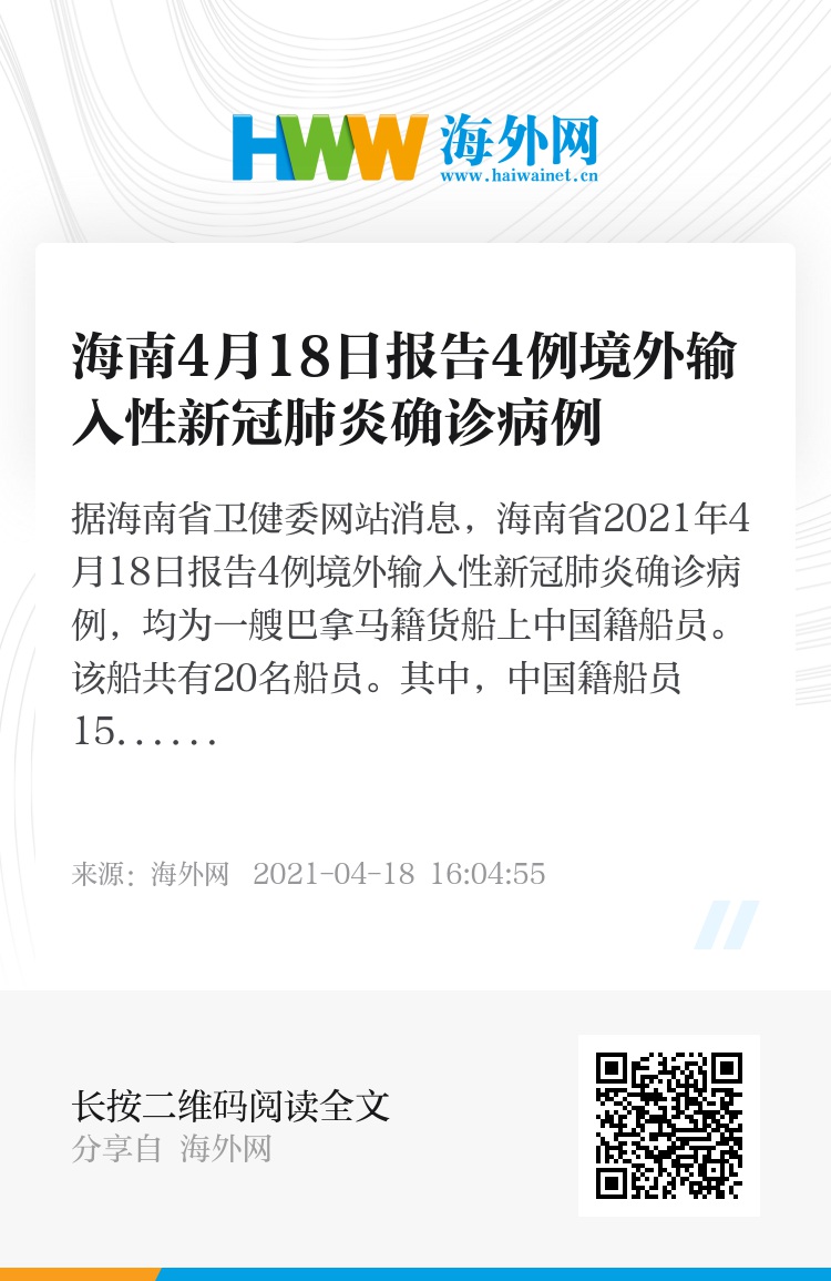 据海南省卫健委网站消息,海南省2021年4月18日报告4例境外输入性新冠肺炎确诊病例,均为一艘巴拿马籍货船上中国籍船员。