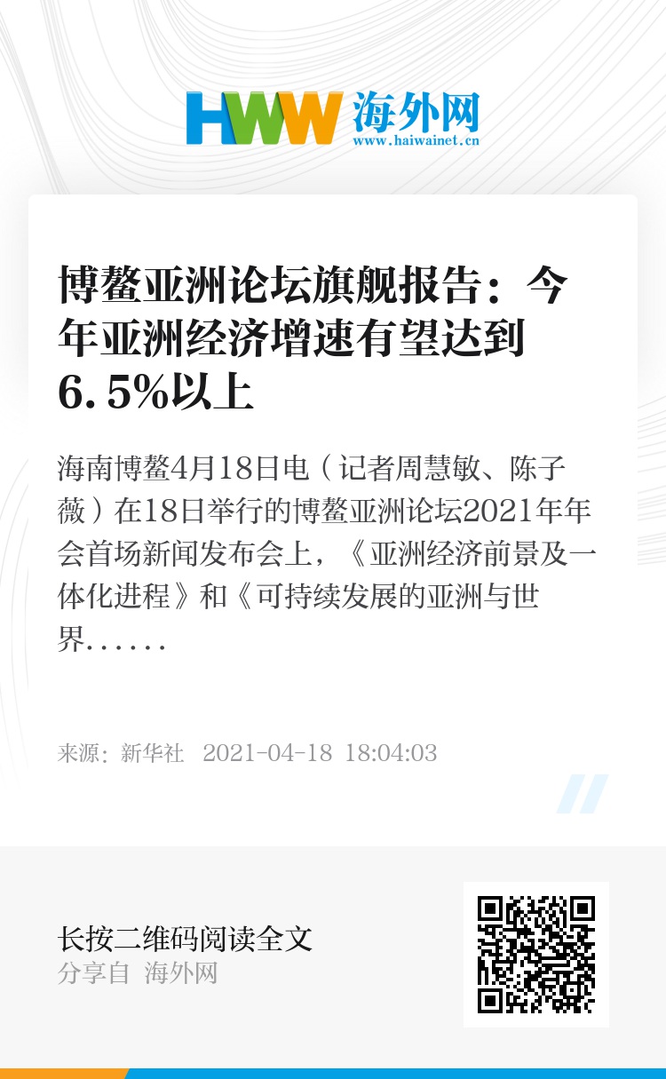 新华社海南博鳌4月18日电(记者周慧敏、陈子薇)在18日举行的博鳌亚洲论坛2021年年会首场新闻发布会上,《亚洲经济前景及一体化进程》和《可持续发展的亚洲与世界》2021年度报告正式发布。报告认为,今年亚洲经济将出现恢复性增长,经济增速有望达到6.5%以上,亚洲将成为全球可持续复苏的重要引擎。