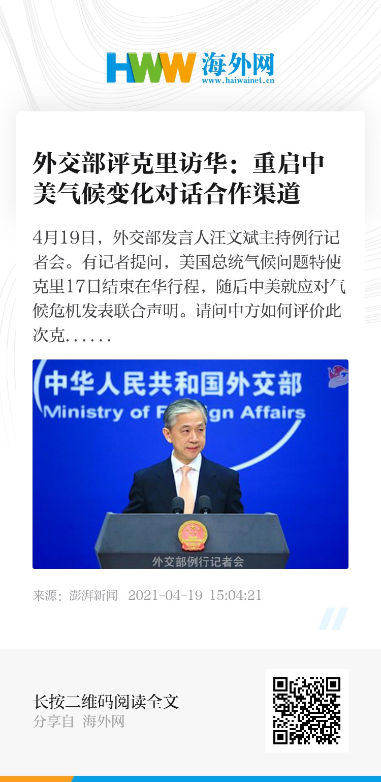 汪文斌表示,应中方邀请,美国总统气候问题特使约翰·克里于4月14日至17日访华,期间,中共中央政治局常委、国务院副总理韩正在北京通过视频方式会见了克里特使,中国气候变化事务特使解振华同克里特使在上海举行了会谈。会谈结束后,双方发表了应对气候危机联合声明,这次会谈期间,双方就合作应对气候变化、领导人气候峰会、联合国气候变化框架公约、第26次气候会议等议题进行了坦诚深入建设性的沟通交流,取得了积极的进展,重启中美气候变化对话合作渠道。