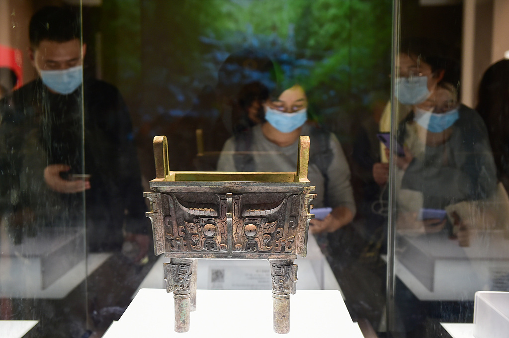 图为游客在河南洛阳市博物馆“河洛遗珍—洛阳都市圈文物联展”上,参观“西周时期兽面纹方鼎”等文物。图片来源:视觉中国