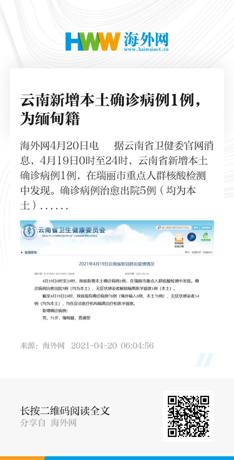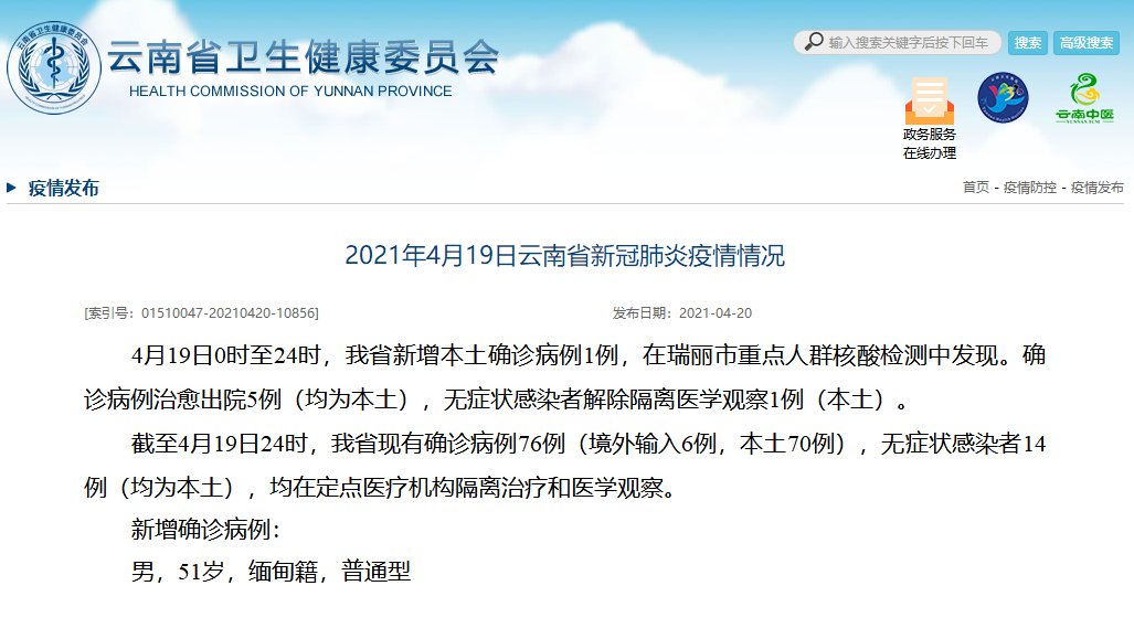 海外网4月20日电 据云南省卫健委官网消息,4月19日0时至24时,云南省新增本土确诊病例1例,在瑞丽市重点人群核酸检测中发现。确诊病例治愈出院5例(均为本土),无症状感染者解除隔离医学观察1例(本土)。
