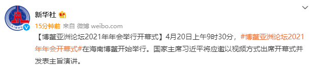 4月20日上午9时30分,博鳌亚洲论坛2021年年会开幕式在海南博鳌开始举行。国家主席习近平将应邀以视频方式出席开幕式并发表主旨演讲。