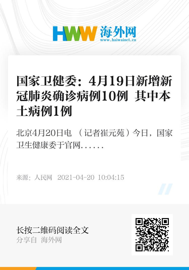 人民网北京4月20日电 (记者崔元苑)今日,国家卫生健康委于官网发布了截至4月19日24时新型冠状病毒肺炎疫情最新情况。4月19日0―24时,31个省(自治区、直辖市)和新疆生产建设兵团报告新增确诊病例10例,其中境外输入病例9例(上海3例,福建2例,浙江1例,湖北1例,四川1例,陕西1例),本土病例1例(在云南);无新增死亡病例;无新增疑似病例。