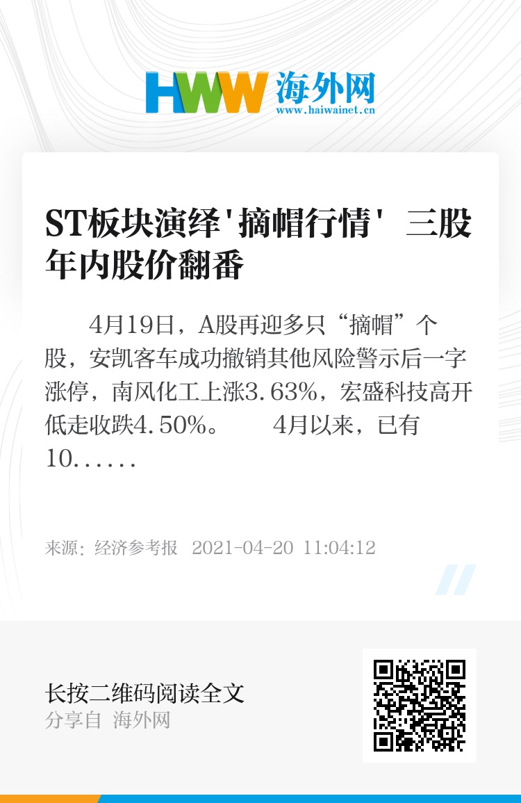 4月19日,A股再迎多只“摘帽”个股,安凯客车成功撤销其他风险警示后一字涨停,南风化工上涨3.63%,宏盛科技高开低走收跌4.50%。
