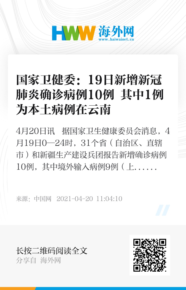 中国网4月20日讯 据国家卫生健康委员会消息,4月19日0—24时,31个省(自治区、直辖市)和新疆生产建设兵团报告新增确诊病例10例,其中境外输入病例9例(上海3例,福建2例,浙江1例,湖北1例,四川1例,陕西1例),本土病例1例(在云南);无新增死亡病例;无新增疑似病例。