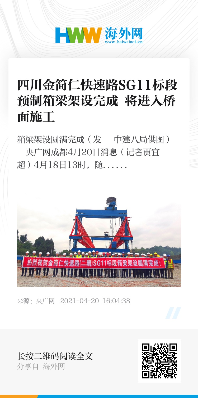 央广网成都4月20日消息(记者贾宜超)4月18日13时,随着中建八局金简仁快速路(二期)(金堂大道至机场南线)SG11标段项目最后一榀预制箱梁架设到位,标志着该项目箱梁架设任务圆满完成,下一步将进入桥面施工。