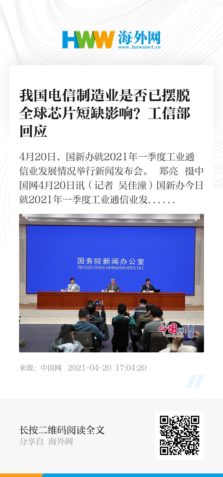 中国网4月20日讯(记者 吴佳潼)国新办今日就2021年一季度工业通信业发展情况举行新闻发布会,谈及全球芯片短缺潮,工业和信息化部新闻发言人、运行监测协调局局长黄利斌回应,目前来看,全球半导体工业紧张局面的缓解还有赖于全球产业链的畅通合作。