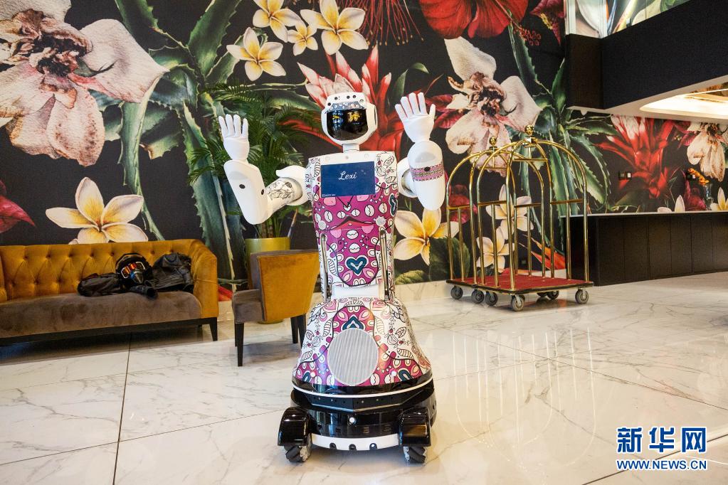 图为4月19日,机器人员工莱克茜在南非约翰内斯堡一间酒店大堂迎接旅客。新华社发(耶希尔 摄)