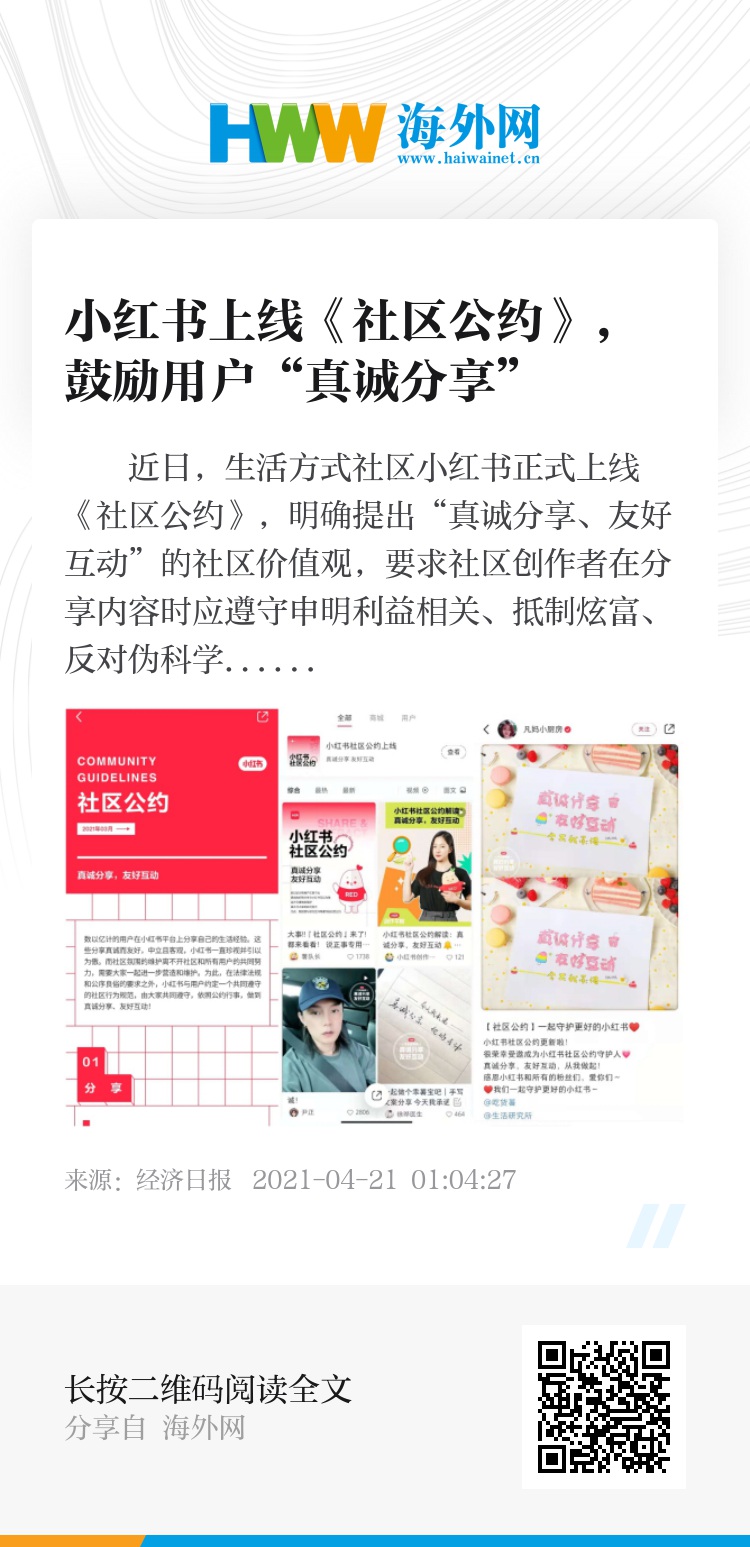 近日,生活方式社区小红书正式上线《社区公约》,明确提出“真诚分享、友好互动”的社区价值观,要求社区创作者在分享内容时应遵守申明利益相关、抵制炫富、反对伪科学、避免过度修饰等分享原则,同时号召用户在进行互动中遵循尊重他人及其劳动成果、鼓励普通人分享等规范。