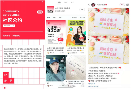 《社区公约》的上线也引发众多小红书创作者发布笔记参与讨论。因在小红书记录减肥过程获得全网关注的演员尹正表示,“小红书里面没有过多的戾气,是一方净土,纯分享生活,可以不说,但一定不说假话,好就是好、不好就是不好。”并呼吁粉丝一起珍惜小红书的社区土壤和环境。