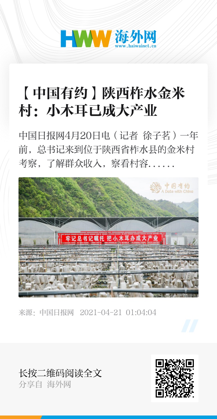 中国日报网4月20日电(记者 徐子茗)一年前,总书记来到位于陕西省柞水县的金米村考察,了解群众收入,察看村容村貌,夸奖金米村把小木耳办成了大产业。考察时强调,脱贫摘帽不是终点,而是新生活、新奋斗的起点。接下来要做好乡村振兴这篇大文章,推动乡村产业、人才、文化、生态、组织等全面振兴。