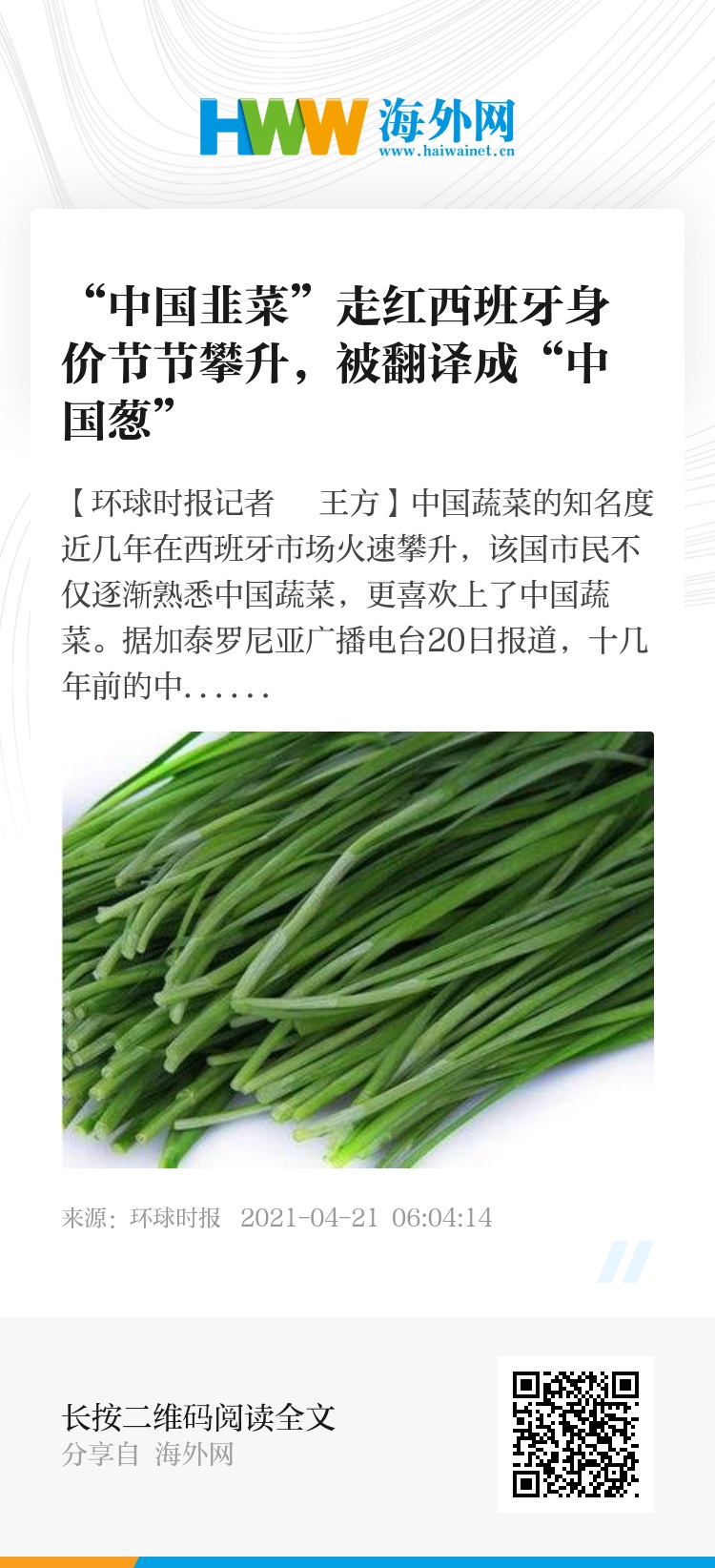 《环球时报》记者曾向一些南美人店主了解中国蔬菜的销售情况,受访者表示非常满意,基本在进货后2-3天就能售完。韭菜尤其受青睐,因为其有益于男性身体健康。但由于这个单词无法直译为西班牙语,所以被翻译成“中国葱”。此外,中国的大白菜、小白菜也让西班牙人刮目相看。中餐馆里的厨师在炒大白菜时加入西班牙火腿,这道中西合璧的菜式很受当地人欢迎。
