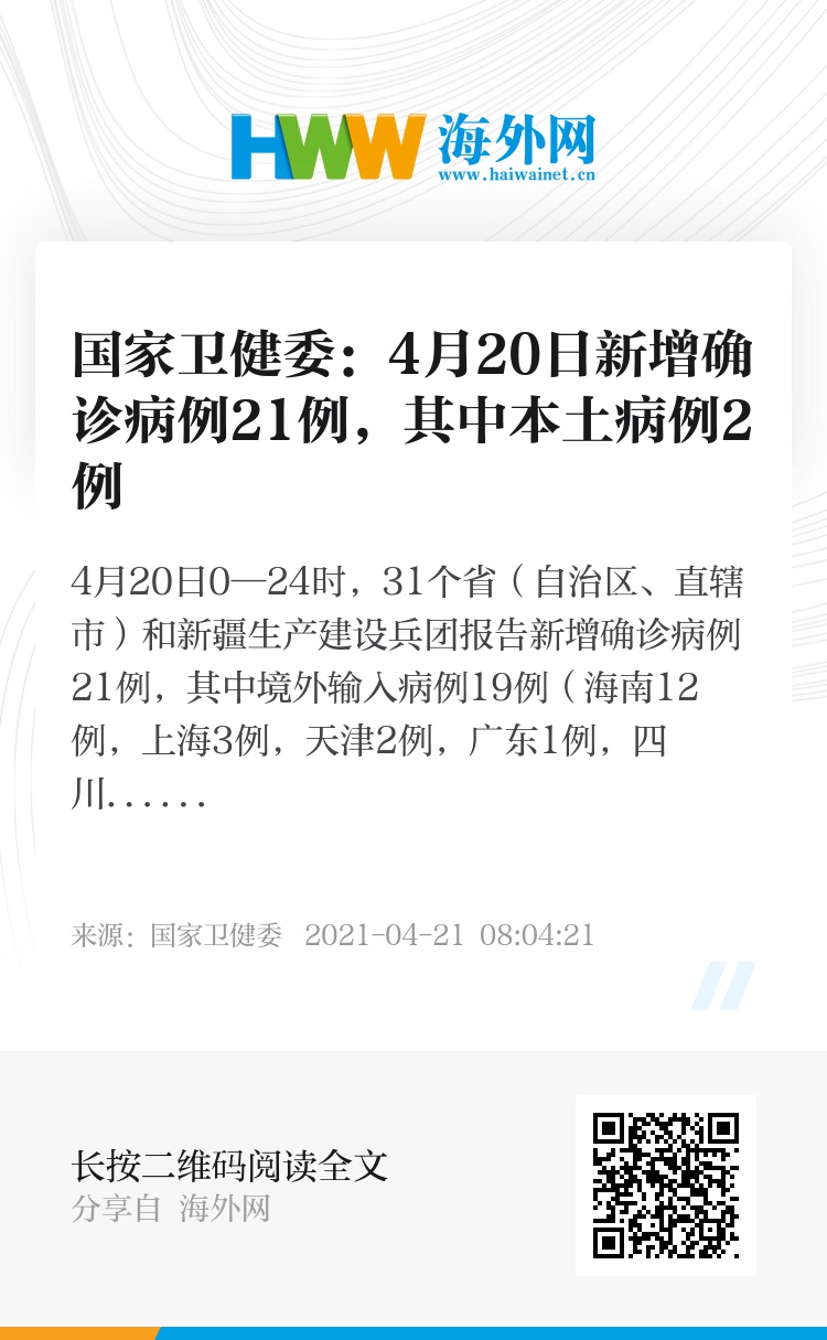 4月20日0—24时,31个省(自治区、直辖市)和新疆生产建设兵团报告新增确诊病例21例,其中境外输入病例19例(海南12例,上海3例,天津2例,广东1例,四川1例),本土病例2例(均在云南);无新增死亡病例;无新增疑似病例。